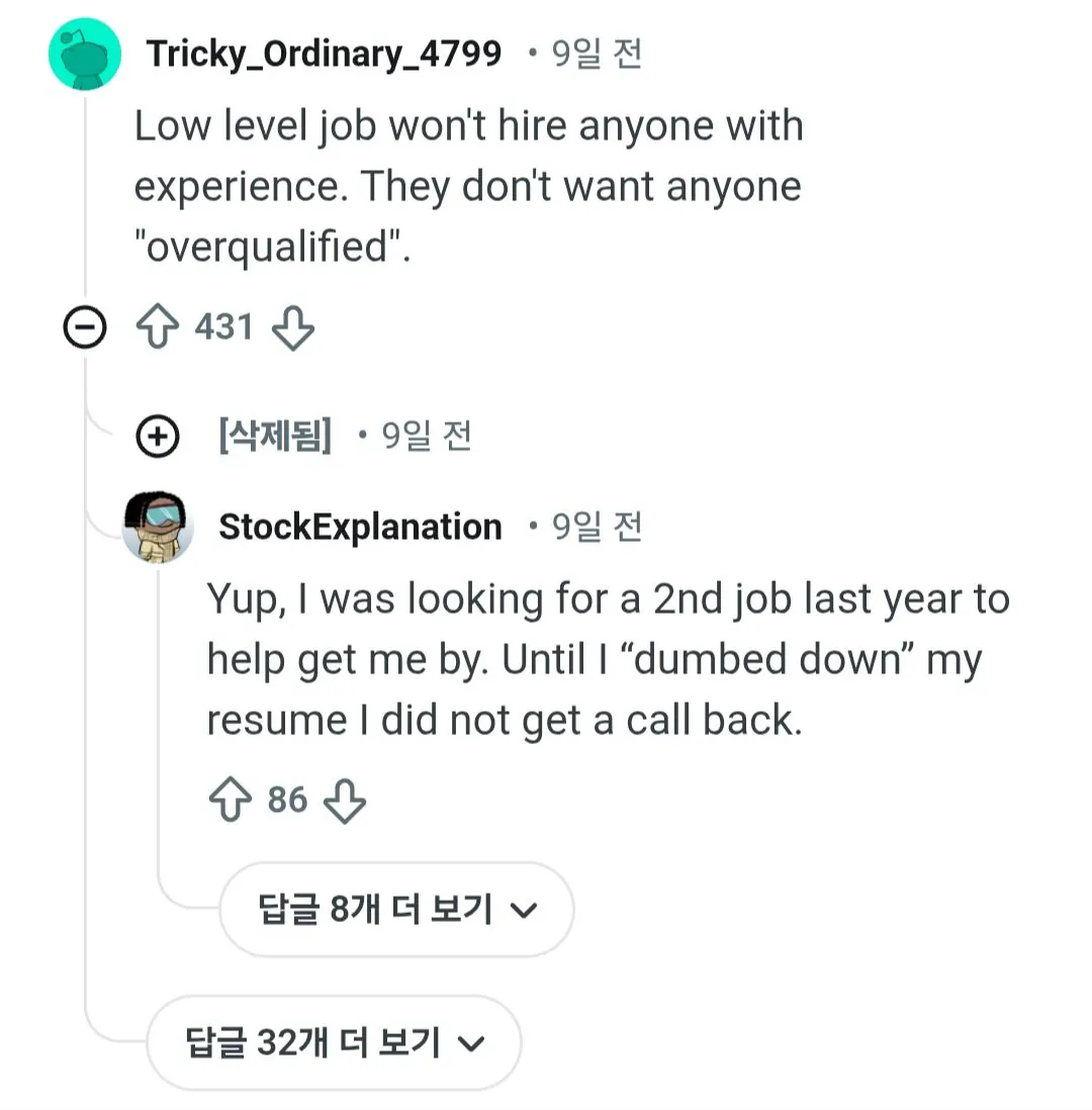 ㄴ(댓글) 맞아요, 저도 작년에 생계에 보탬이 되려고 투잡을 알아봤거든요. 이력서를 일부러 "낮춰 잡기(dumbed down)" 전까지는 전화 한 통 안 오더라고요.