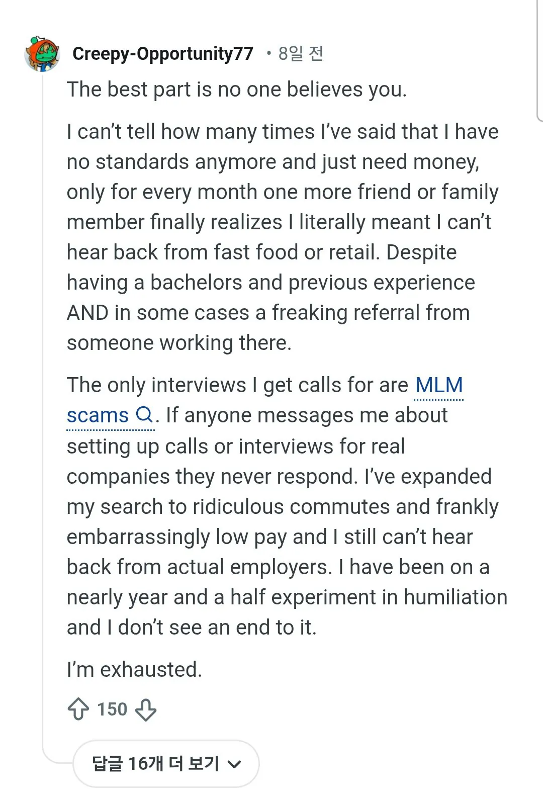 이제 눈높이 따위는 완전히 버렸고 그저 돈이 절실하다고 수없이 말해왔지만, 한 달 한 달이 지날 때마다 내 친구나 가족들은 그제야 제가 진짜로 패스트푸드점이나 소매점에서도 연락 한 통 못 받고 있다는 사실을 깨닫곤 합니다. 학사 학위에 이전 경력도 있고, 심지어 어떤 곳은 지인 추천까지 받아서 지원했는데도 말이죠.