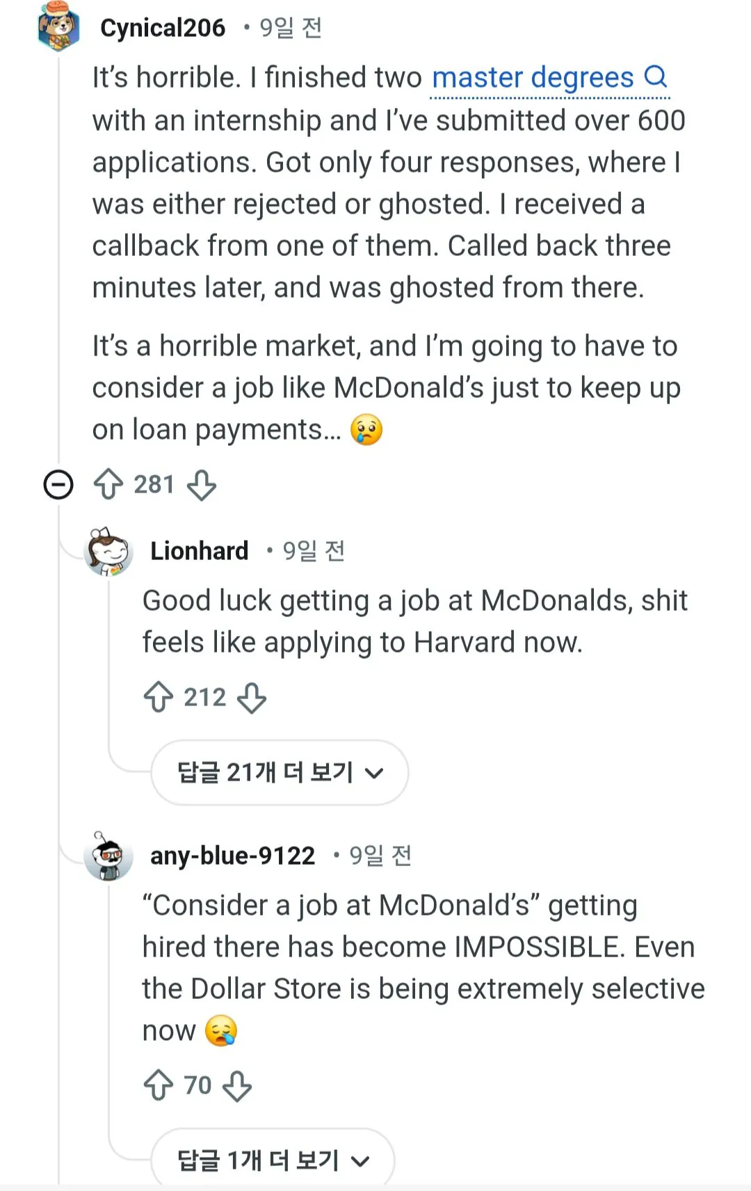 ㄴ(댓글) 맥도날드 취업? 행운을 빌어요. 요즘은 거기 지원하는 게 하버드 대학 입학 시험 치는 기분이니까요.