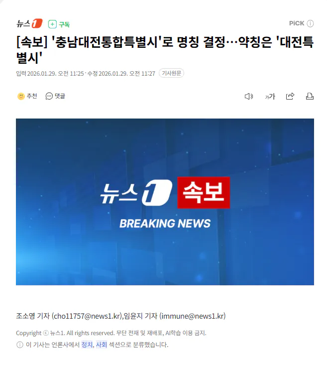 "충남대전통합특별시"로 명칭 결정