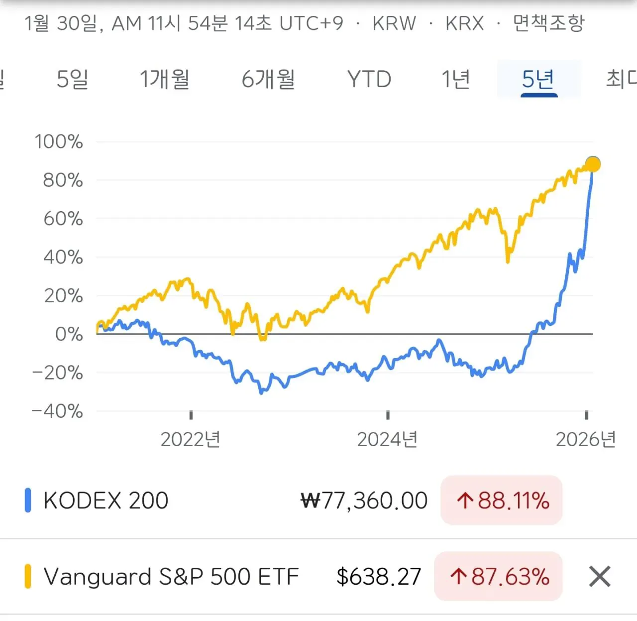 속보) 코스피200 5년 수익률 S&P500 역전!!