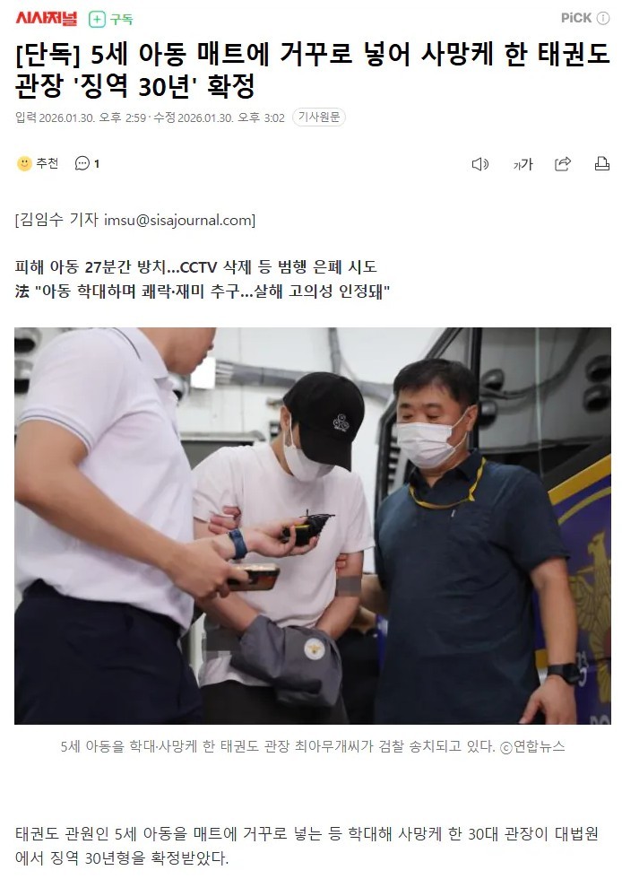 5세 아동 사망케 한 태권도 관장 형량 확정