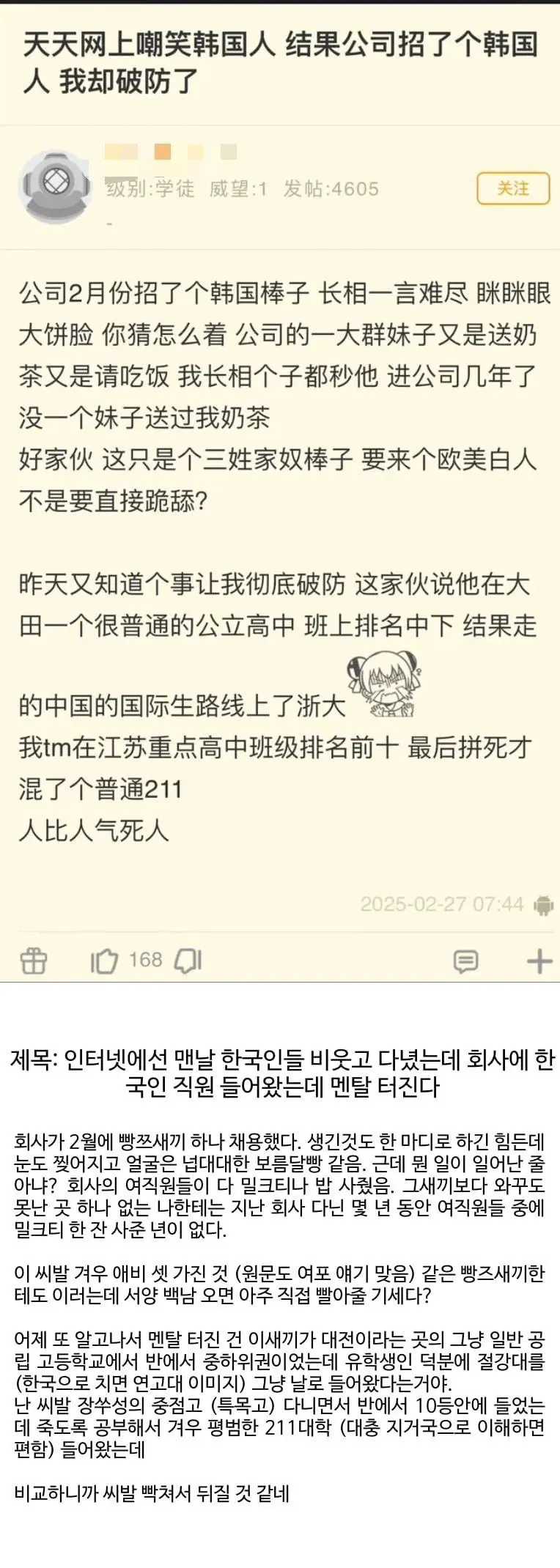 한국인 신입 때문에 개빡친 중국인