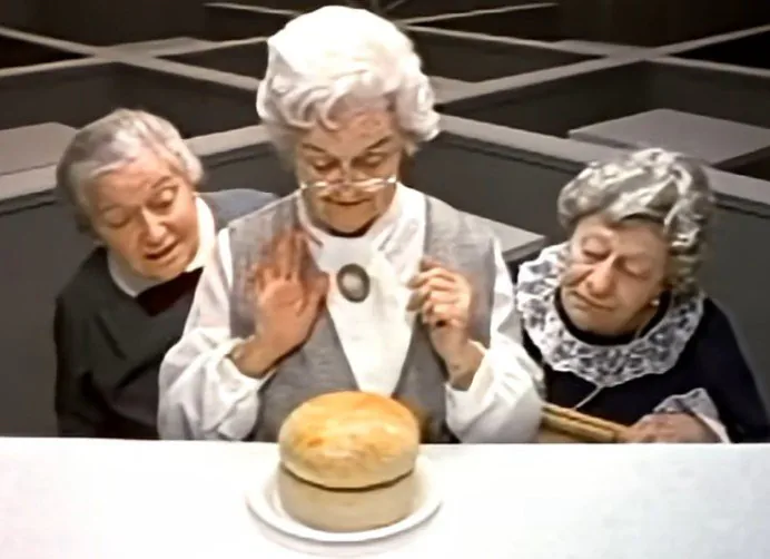 큰 빵이 있는 햄버거를 보는 세 할머니