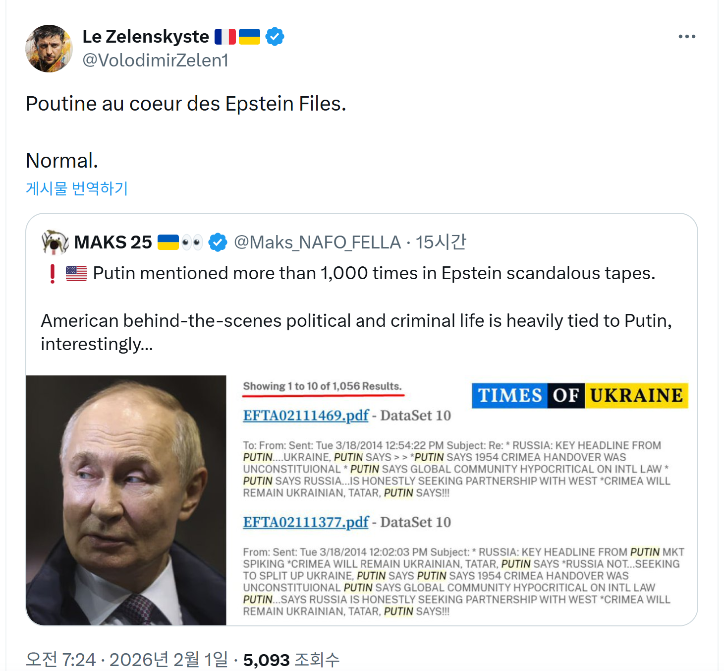 엡스타인 파일에 푸틴이 1000번 이상 언급된 걸로 확인