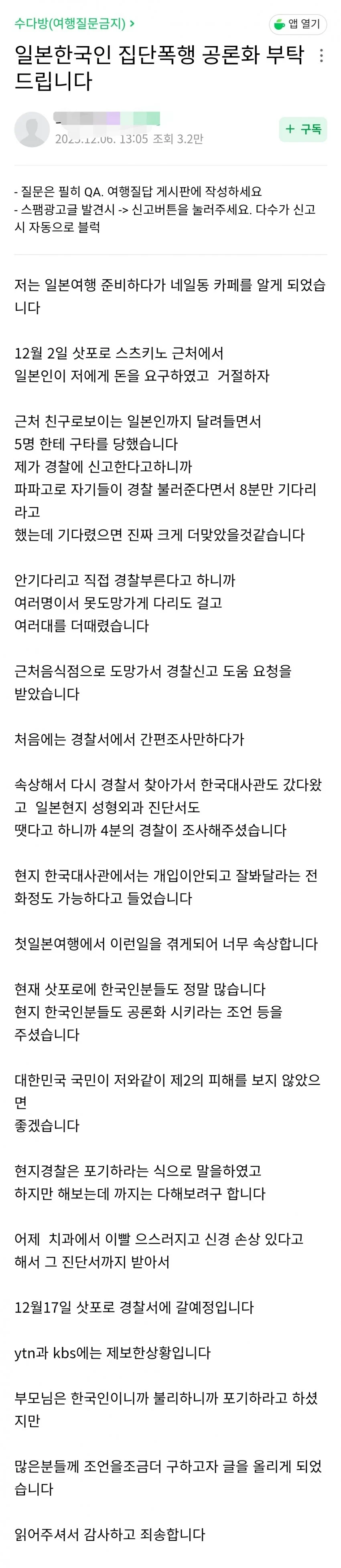 - 피해자 분은 사건 접수 후 수사를 위해 삿포로 재입국