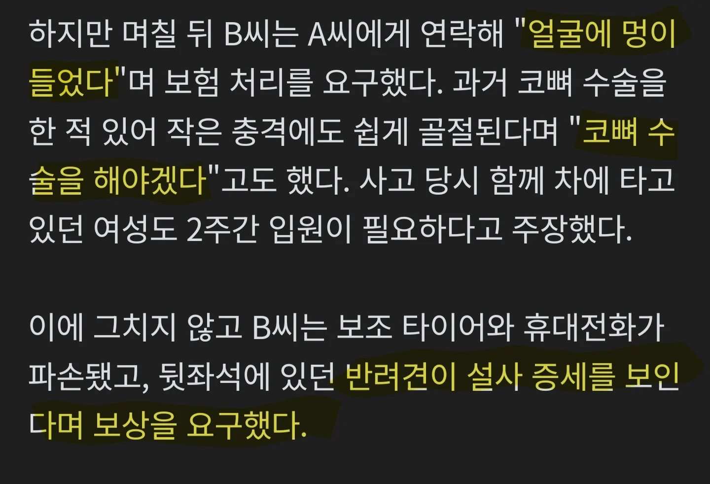 얼굴 멍, 코뼈골절, 배우자 2주입원, 휴대폰 파손, 반려견 설사증세 주장함
