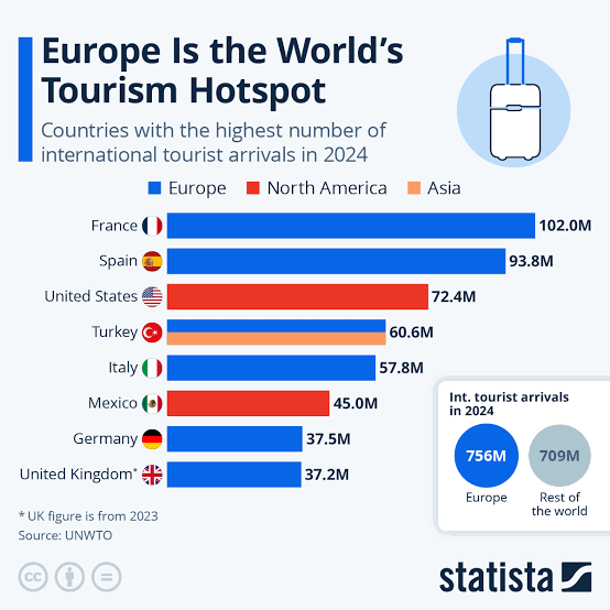유럽은 예나 지금이나 세계 최대의 관광 지역임. 특히 로마제국 지역인 프랑스, 스페인, 이탈리아 트로이카는 유럽내에서도 유명한 관광 지역들.