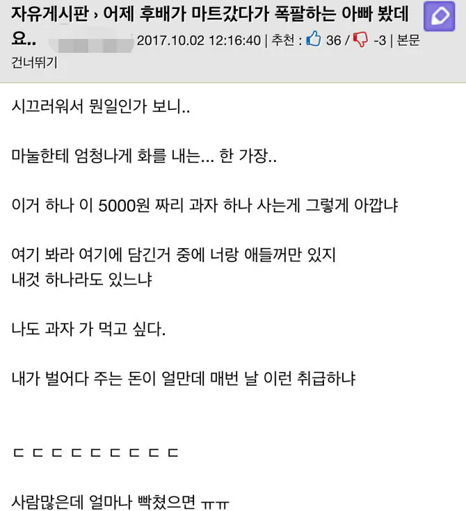 마트에서 폭발한 가장 댓글 0 조회 507 2026-02-06 20:18 더한마음 Lv.8 게시글 보기 총 게시글: 1,614개 총 댓글: 0개 더한마음님의 다른 글 26.02.06 엄마가 길에서 텐프로 가냐고 함 26.02.06 현대차의 보스톤 다이나믹스 로봇 근황 26.02.06 마트에서 폭발한 가장 26.02.06 비누로 씻지 말라는 와이프