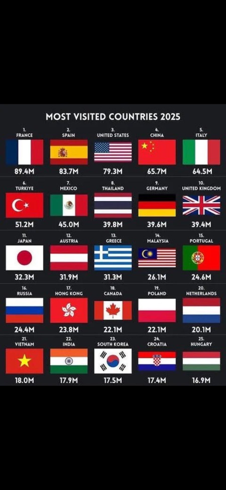 2025년 국가별 관광객 유치 순위