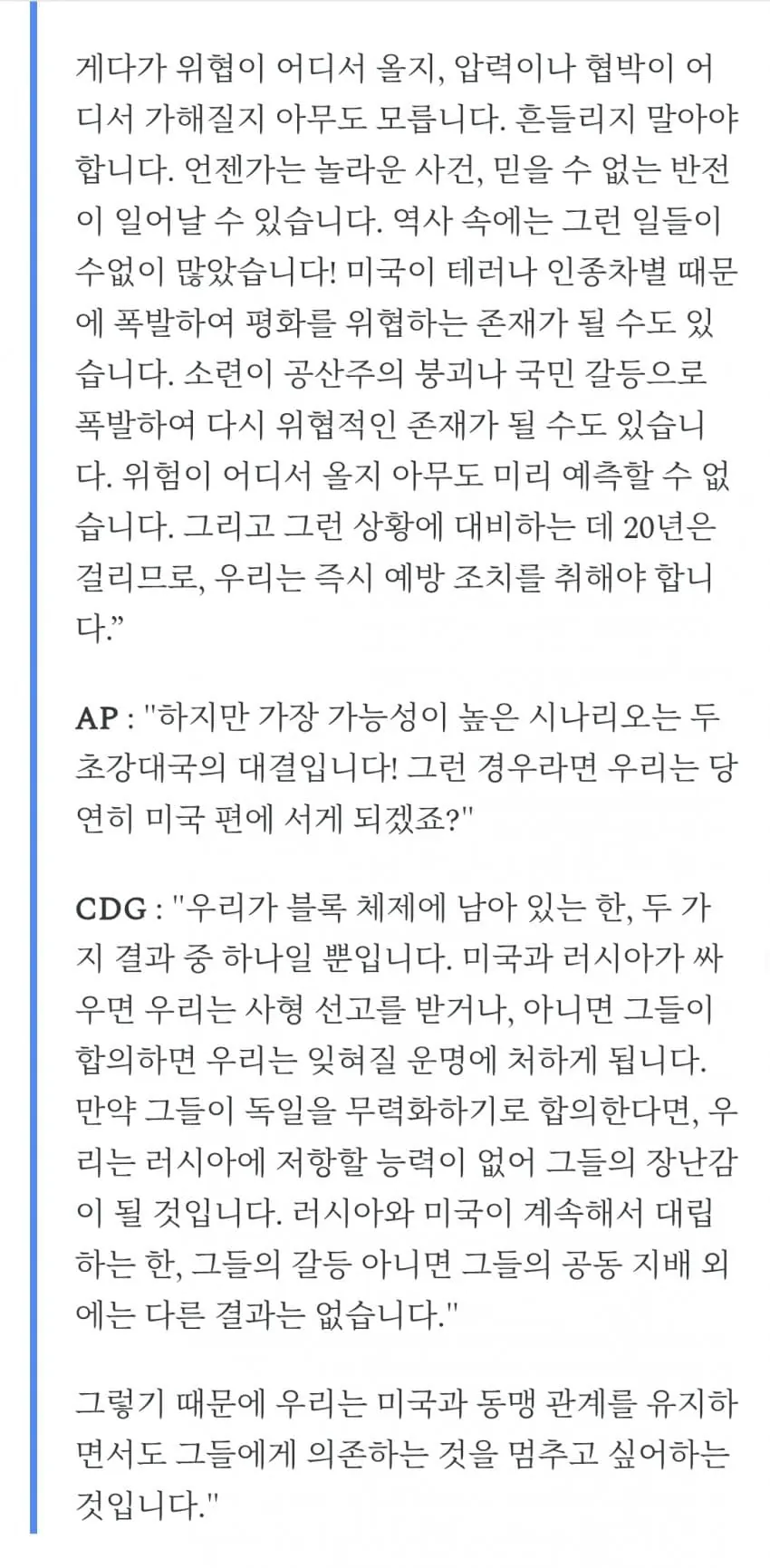 "두 강대국이 대치하고 있다면 우리는 사형 선고를 받거나, 잊혀질 운명. 둘 중 하나다."