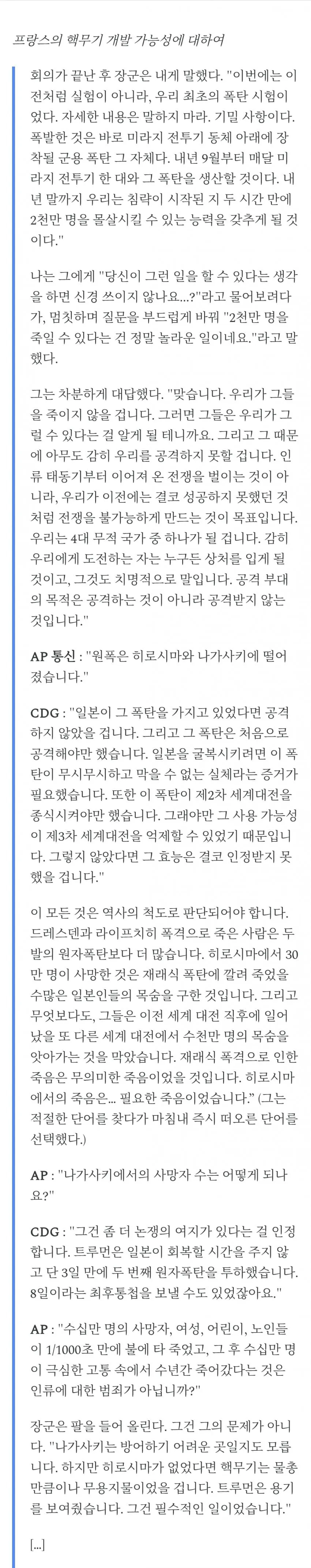 "나가사키와 히로시마는 비극이었지만, 원자 폭탄 투하가 오히려 재래식 폭격으로 인한 희생자를 막았던 것입니다."