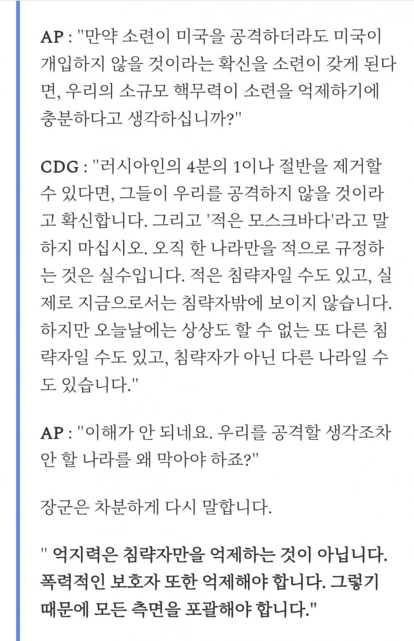 "(핵무기를 통한) 억지력은... 침략자를 방어하는것뿐만 아니라, 폭력적인 보호자를 억제할 수도 있습니다."