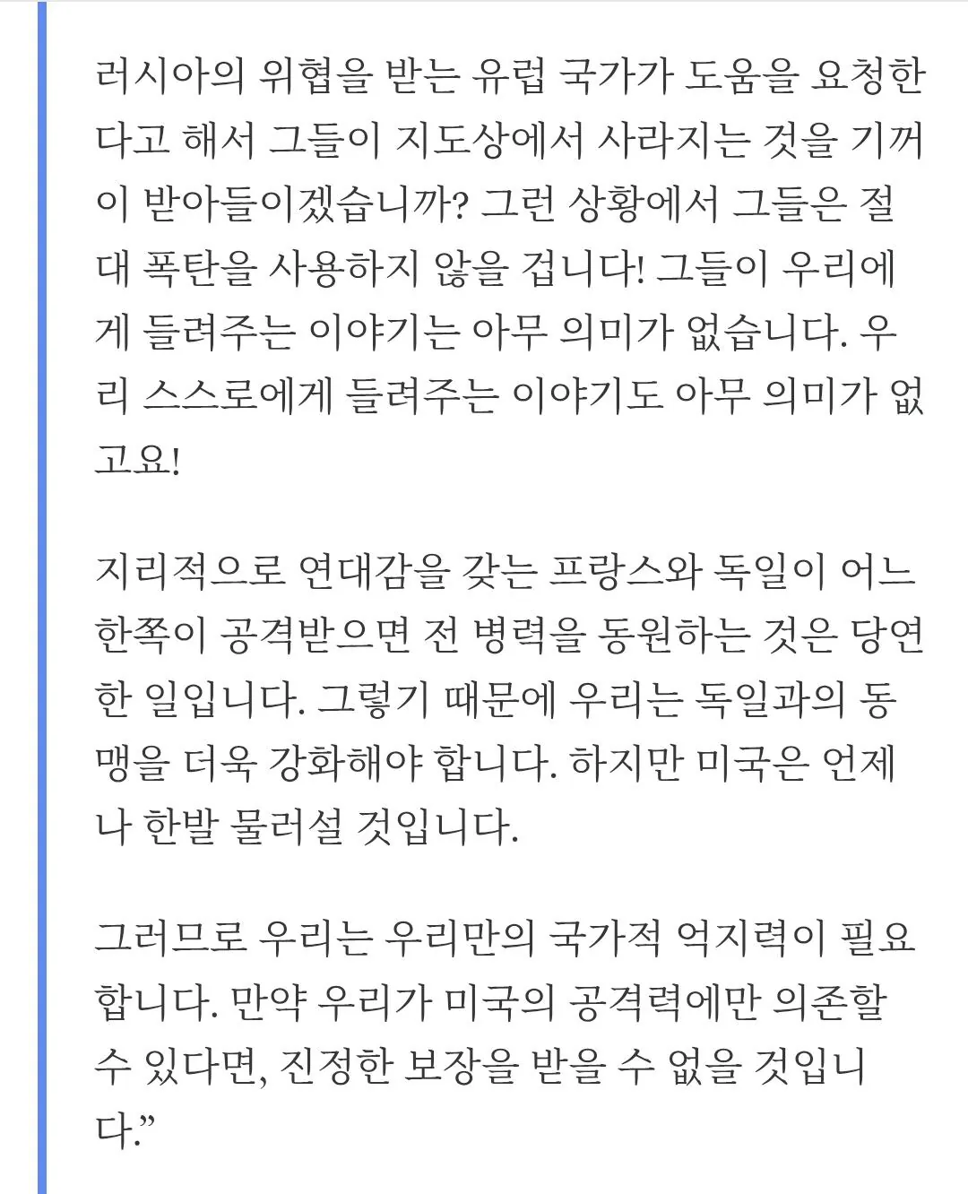 "미국인들이 프랑스와 독일을 위해서 자기들이 지도상에서 사라지는걸 택한다고 믿습니까?"