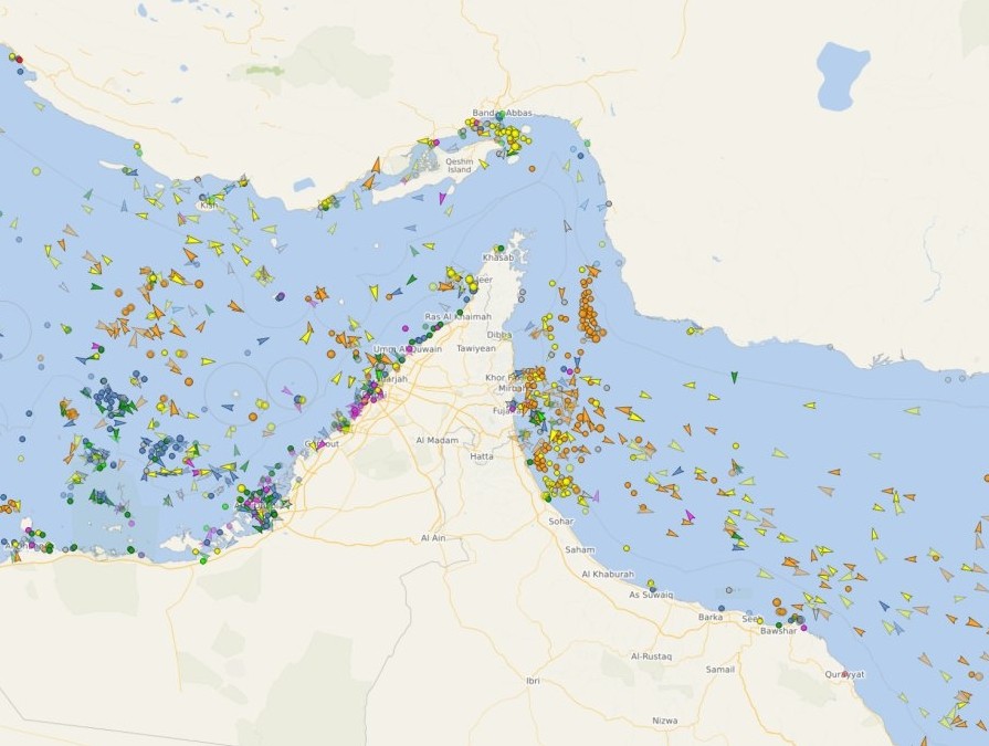 호르무즈 해협 입구에서 못 들어가고 모여있는 중(주황색)