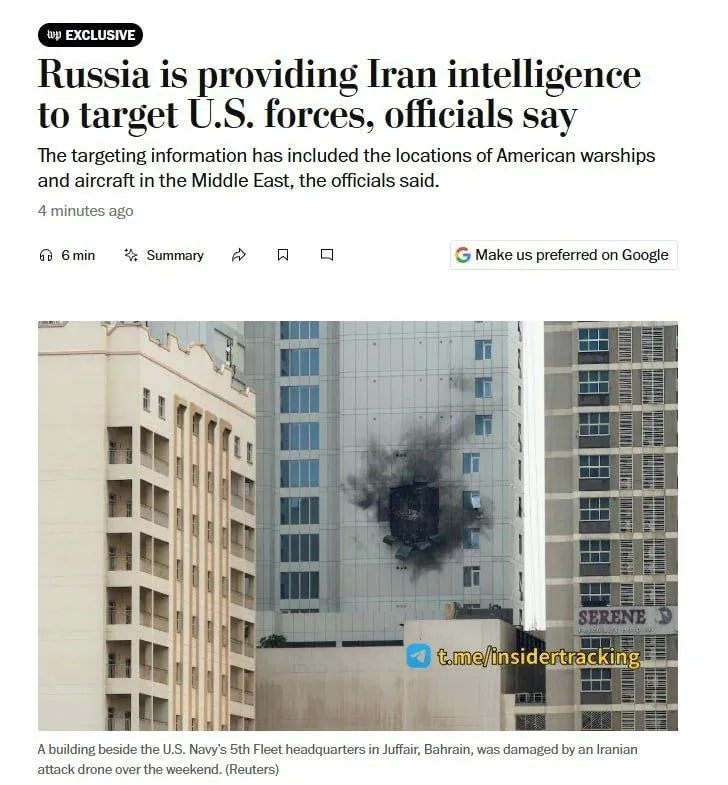 받) 워싱턴 포스트에 따르면 러시아가 중동 내 미군 목표물 타격을 위해 이란에 정보 제공 중이라고 미국 당국자들이 밝힘.