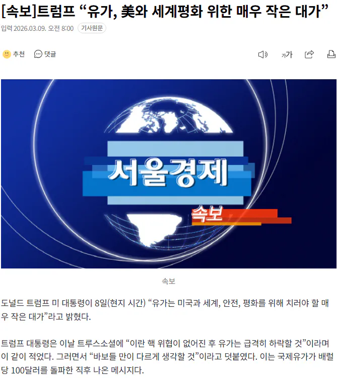 트럼프 “유가, 美와 세계평화 위한 매우 작은 대가”