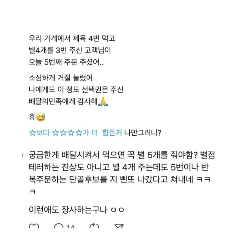 별점 4개 3번 준 고객 주문 거절한 식당 사장