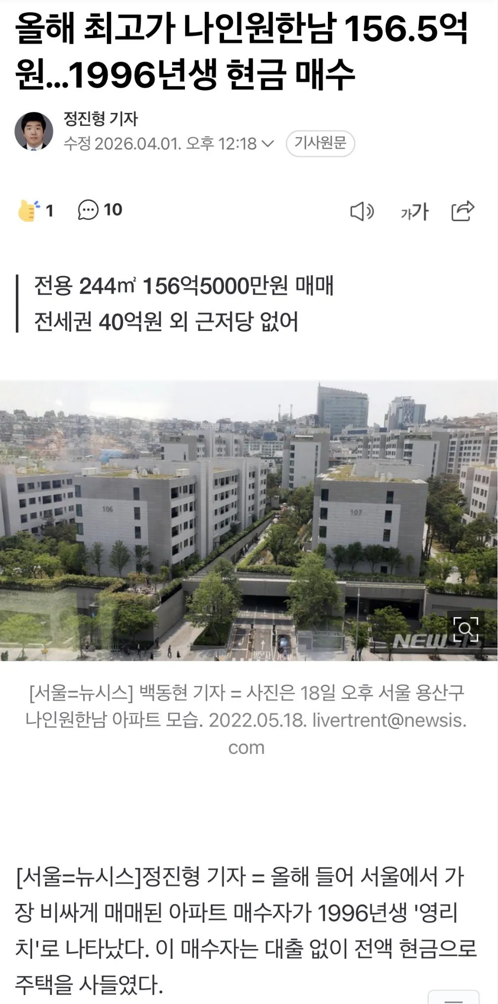 올해 최고가 나인원한남 156.5억원…1996년생 현금 매수
