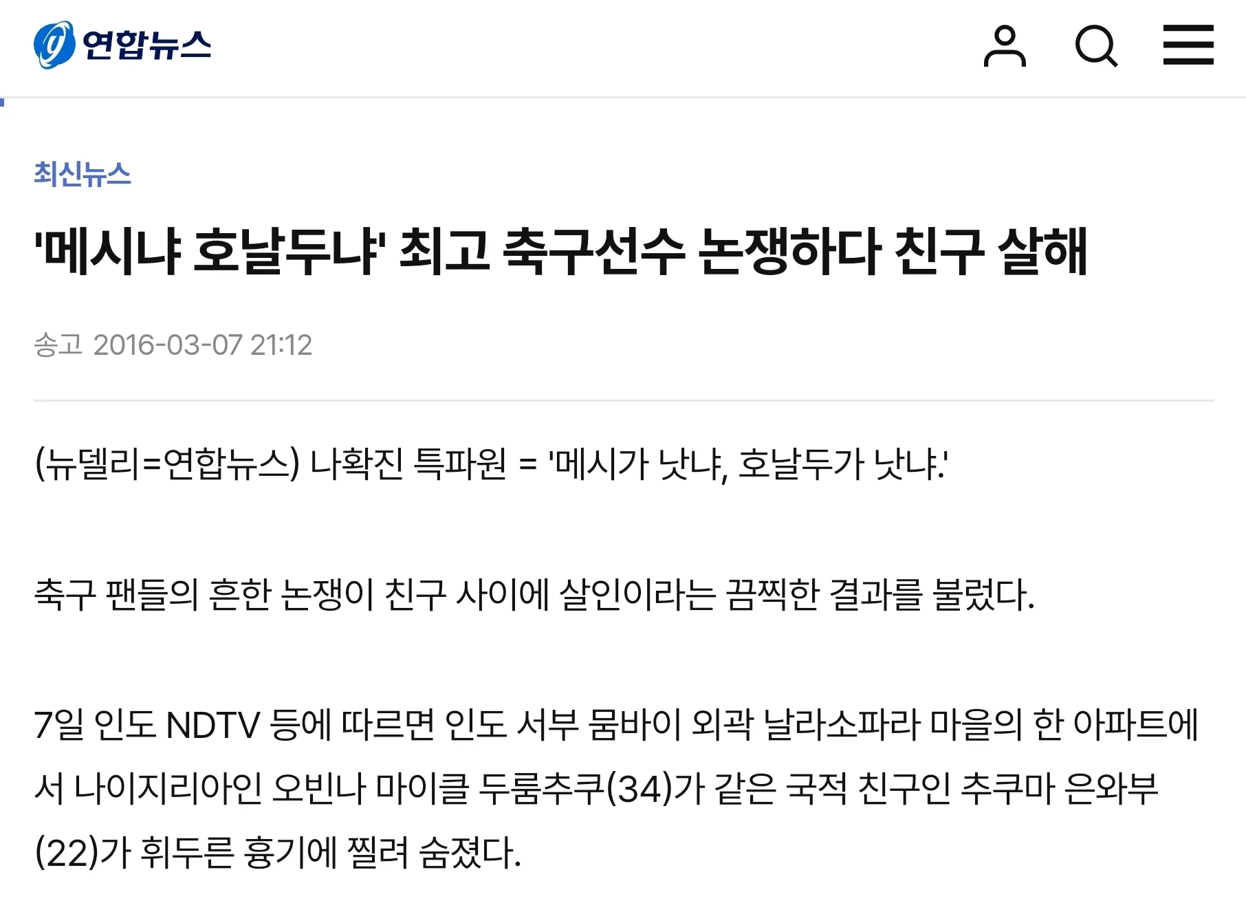 살인까지 발생할 수 있는 토론 주제 댓글 0 조회 579 2025-10-05 19:04 개장수11 Lv.7 게시글 보기 총 게시글: 497개 총 댓글: 0개 '메시냐 호날두냐' 최고 축구선수 논쟁하다 친구 살해 | 연합뉴스 메시 vs 호날두 격렬한 토론 끝에 호쪽이 메쪽 칼찌함 개장수11님의 다른 글 25.10.14 삼성 갤럭시 스마트폰 3분기도 점유율 떡상 25.10.14 모델Y 주니퍼 미친 판매량이네요 ㄷㄷ 25.10.14 얼마전 중국에서 일어난 레전드 교통사고 장면 25.10.14 내일 오랜만에 한국에 돌아오는 인앤아웃