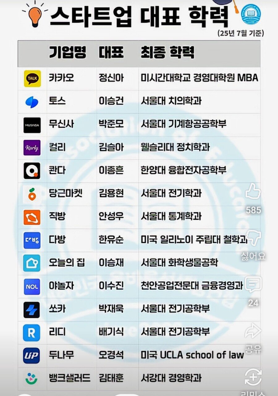 국내 유명 스타트업 회사 대표들 학력 댓글 0 조회 519 2025-10-06 14:35 갓파 Lv.10 게시글 보기 총 게시글: 481개 총 댓글: 0개 캬 역시 서울대 서울대의 나라 대한민국은 서울대 모든 대한민국 혁신은 서울대생으로부터 나옴 갓파님의 다른 글 25.10.14 경차 오너들이 퇴근을 기다리는 이유 25.10.14 대한민국 정부 북한에 삥뜯겨.. 25.10.14 낭만 ㅈ된다는 직업류 원탑 25.10.14 사회초년생 차산지 한달만에 과태료