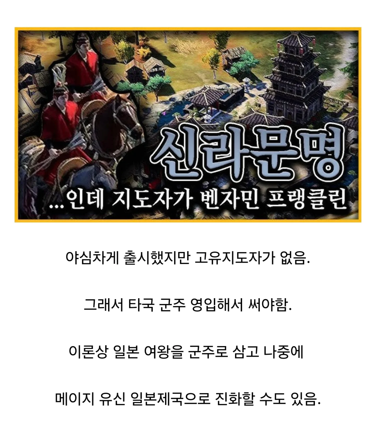 야심차게 신라 문명을 추가한 문명 7 근황 댓글 0 조회 562 2025-10-06 13:34 더한마음 Lv.8 게시글 보기 총 게시글: 500개 총 댓글: 0개 놀랍게도 일본 여왕 히미코의 특성과 신라의 문명 특성이 잘 어울려서 성능픽이라고 한다. 파이락시스 이놈들 임나일본부설 신봉자였나? 더한마음님의 다른 글 25.10.14 경차 오너들이 퇴근을 기다리는 이유 25.10.14 대한민국 정부 북한에 삥뜯겨.. 25.10.14 낭만 ㅈ된다는 직업류 원탑 25.10.14 사회초년생 차산지 한달만에 과태료