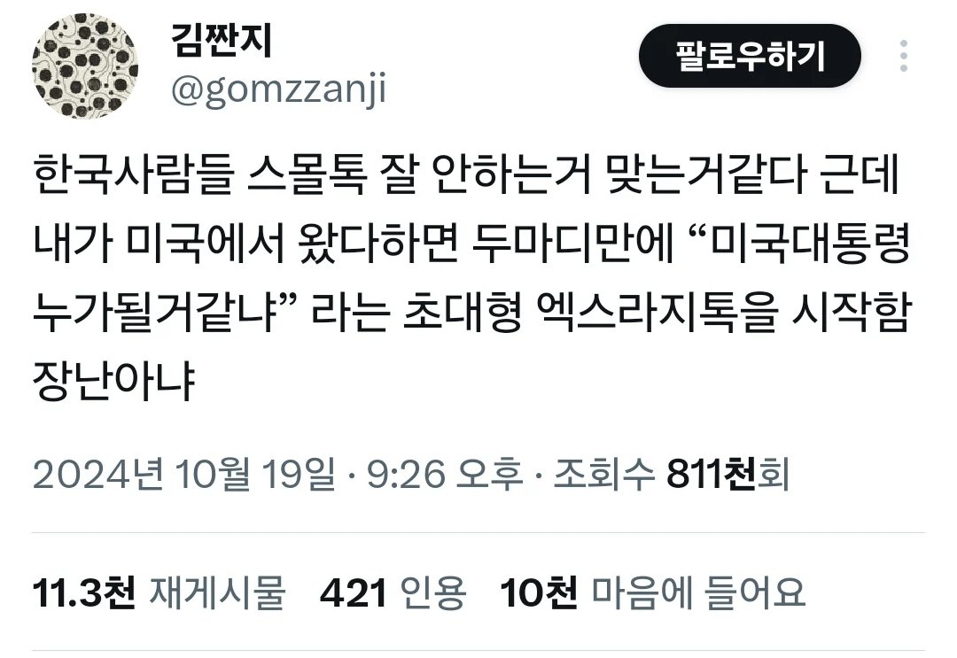 한국인은 스몰톡 잘 안하는 건 맞다 댓글 0 조회 545 2025-10-06 13:34 관셈보살 Lv.3 게시글 보기 총 게시글: 492개 총 댓글: 0개 관셈보살님의 다른 글 25.10.14 경차 오너들이 퇴근을 기다리는 이유 25.10.14 대한민국 정부 북한에 삥뜯겨.. 25.10.14 낭만 ㅈ된다는 직업류 원탑 25.10.14 사회초년생 차산지 한달만에 과태료
