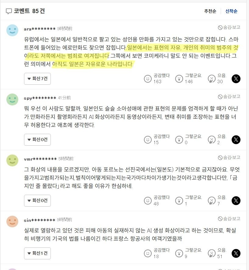 "아동 포르노" 보다가 잘린 日 기술위원장, 이건 "예술이다" 주장 댓글 0 조회 577 2025-10-08 14:37 갓파 Lv.10 게시글 보기 총 게시글: 450개 총 댓글: 0개 다른나라 비행기에서 소아성애 야동보다 걸린 수치사건을 "일본은 프랑스보다 자유로운 나라"라는 논리로 귀결시키는 긍정회로 발동 ON 갓파님의 다른 글 25.10.11 자랑스러운 마인크래프트 한국인 기네스 기록 25.10.11 배필6 날려고 발악중인 헬기 뉴비 25.10.11 병사들에게 인기 많은 간부 25.10.11 고도비만 브이로그에는 무조건 출연한다는 음식들