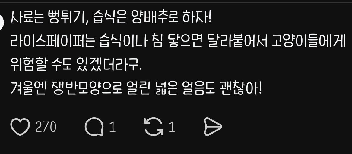 아이큐 140 캣맘 밥그릇 근황 댓글 0 조회 534 2025-10-08 18:10 네이마르로 Lv.4 게시글 보기 총 게시글: 454개 총 댓글: 0개 네이마르로님의 다른 글 25.10.11 자랑스러운 마인크래프트 한국인 기네스 기록 25.10.11 배필6 날려고 발악중인 헬기 뉴비 25.10.11 병사들에게 인기 많은 간부 25.10.11 고도비만 브이로그에는 무조건 출연한다는 음식들