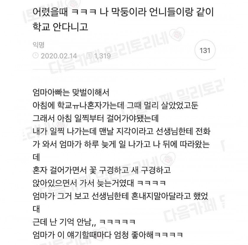 막둥이가 학교 매일 지각했던 이유 댓글 0 조회 519 2025-10-09 20:03 대박노 Lv.7 게시글 보기 총 게시글: 411개 총 댓글: 0개 대박노님의 다른 글 25.10.11 자랑스러운 마인크래프트 한국인 기네스 기록 25.10.11 배필6 날려고 발악중인 헬기 뉴비 25.10.11 병사들에게 인기 많은 간부 25.10.11 고도비만 브이로그에는 무조건 출연한다는 음식들