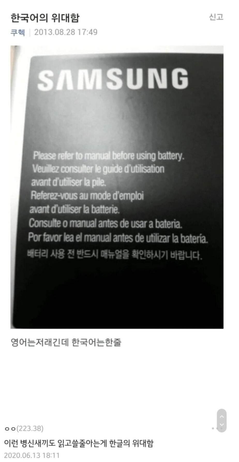 영어 앞에서 더욱더 체감되는 한글의 위대함 댓글 0 조회 595 2025-10-12 08:09 가비슈포댄서 Lv.12 게시글 보기 총 게시글: 469개 총 댓글: 0개 가비슈포댄서님의 다른 글 25.10.12 정승제 "선생님이 힘들까? 학생들이 힘들까?" 25.10.12 요즘 세대는 모르는 물건 25.10.12 꼽주는 거다 VS 드립이다 25.10.12 남자 고객 때문에 현타 온다는 미용사 누나