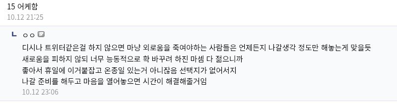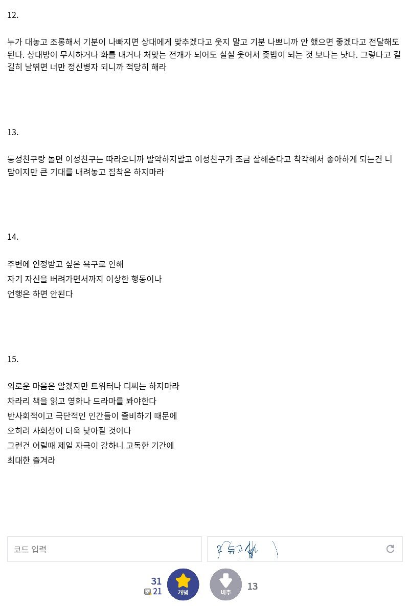 사회성 낮은 사람들을 위한 팁들 댓글 0 조회 587 2025-10-13 08:43 드가쥬아 Lv.13 게시글 보기 총 게시글: 462개 총 댓글: 0개 드가쥬아님의 다른 글 25.10.13 무개념 보행자들 너무 많네요 25.10.13 무인 자동화 된 중국의 항만 컨테이너 터미널 25.10.13 어느 호텔의 미친 뷰 25.10.13 미국에 있다는 김밥천국