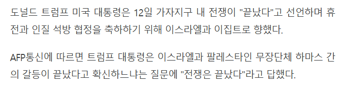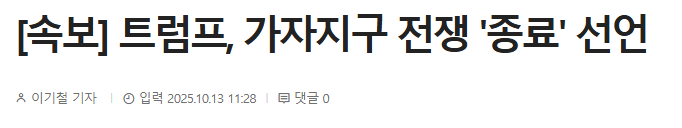 [속보] 트럼프, 가자지구 전쟁 '종료' 선언 댓글 0 조회 555 2025-10-13 14:21 갓파 Lv.10 게시글 보기 총 게시글: 474개 총 댓글: 0개 [속보] 트럼프, 가자지구 전쟁 '종료' 선언 < 전쟁/난민 < 국제 < 기사본문 - 국제뉴스 갓파님의 다른 글 25.10.13 현재 난리났다는 00년생 상황 25.10.13 70대 할아버지가 한의대를 포기한 이유jpg 25.10.13 세종대왕본인 스스로 죄를 처벌할수 없었다 말한 인물 25.10.13 햄버거집에 다녀온 70대 엄마 사연