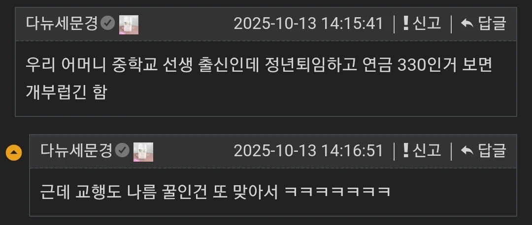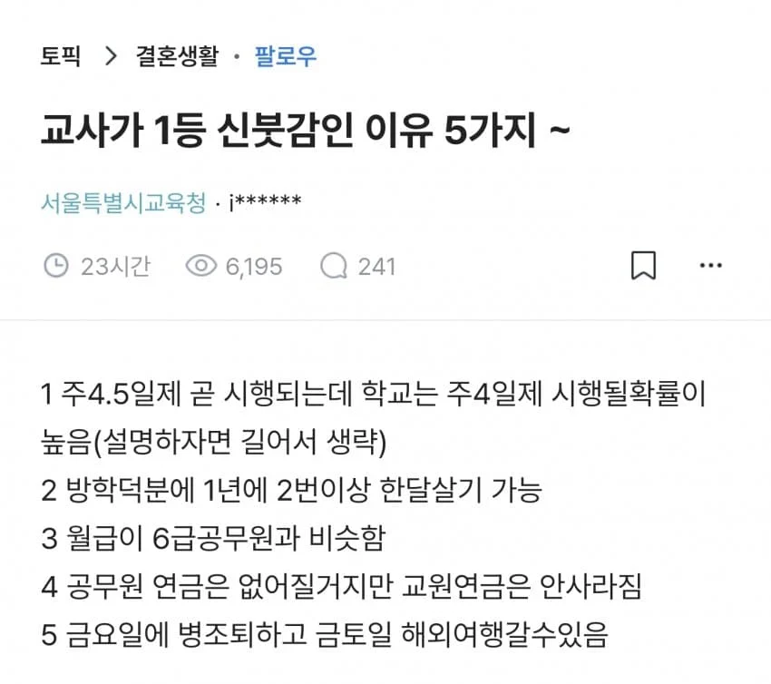 교사가 1등 신붓감인 이유 5가지 댓글 0 조회 550 2025-10-13 20:32 강승 Lv.11 게시글 보기 총 게시글: 475개 총 댓글: 0개 강승님의 다른 글 25.10.13 복싱 재능 없는 애 10년 한 결과 25.10.13 자는 사람 위로 올라간 곰 ㄷㄷ 25.10.13 애들아 코인말고 집사라 25.10.13 대학생이 5학년이 어딨냐 ㅋㅋ 5학년이래 ㅋㅋㅋㅋㅋ