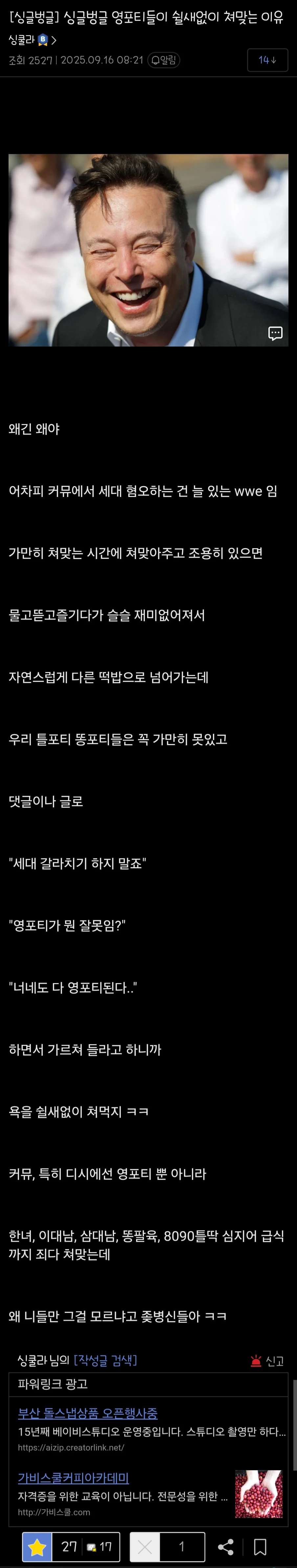 포티햄들이 쉴새없이 뚜드려 맞는 이유 댓글 0 조회 508 2025-10-13 22:23 감정괴물 Lv.5 게시글 보기 총 게시글: 462개 총 댓글: 0개 감정괴물님의 다른 글 25.10.13 여자들이 말하는 남자 외모 평가 속 뜻 25.10.13 40대 여자 와인론에 화난 종근당 누나 25.10.13 아들의 카톡 상태메시지에 감동한 엄마 25.10.13 여친을 너무 잘 아는 남자친구