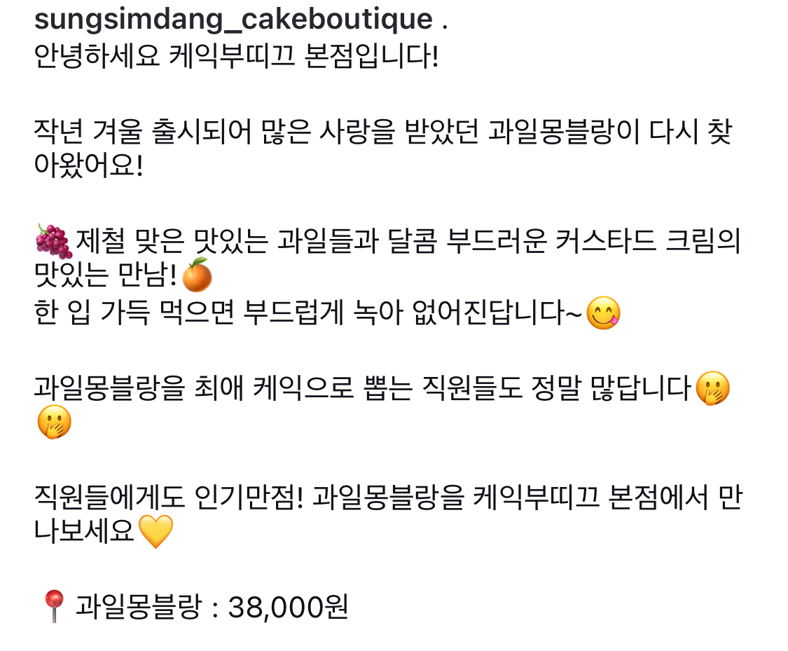 성심당 케익부띠끄 과일몽블랑 출시 & 가격 댓글 0 조회 567 2025-10-14 08:32 감정괴물 Lv.5 게시글 보기 총 게시글: 465개 총 댓글: 0개 감정괴물님의 다른 글 25.10.14 모두에게 기회준 실시간 삼전 상황 25.10.14 모르는 외국인이 자꾸 내 넷플릭스 계정 씀; 25.10.14 요즘 캣맘들의 수류탄 전술 25.10.14 뭔가 이상한 수능 근황