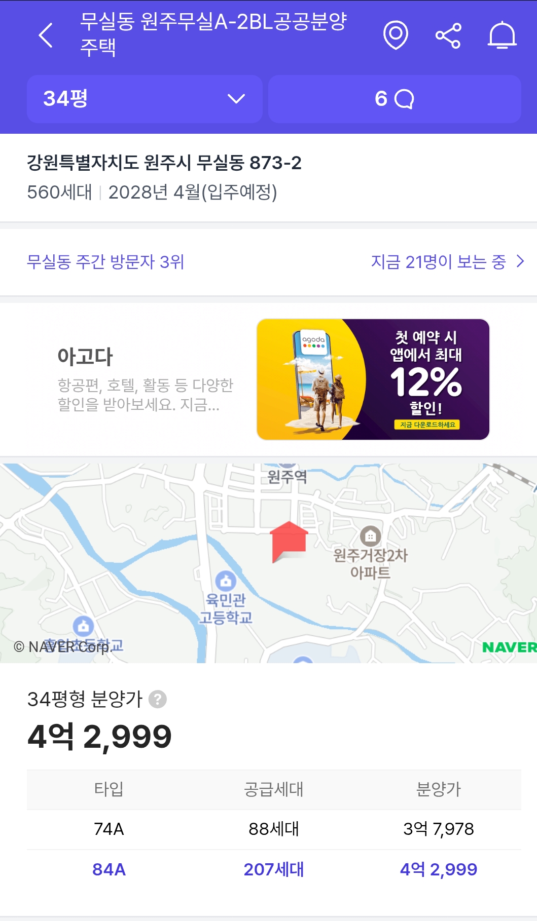 원주의 경우 같은 택지지구내에 있는 공공분양 아파트 국평이 4억 3천에 나옴