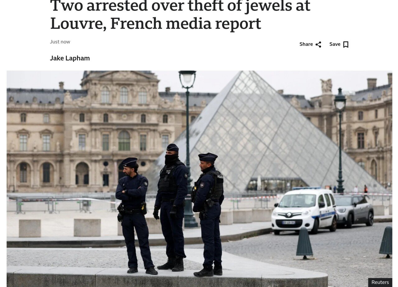 프랑스 언론에 따르면, 파리 루브르 박물관에서 귀중한 왕관 보석을 훔친 혐의로 두 명의 용의자가 체포됐다고 한다. 르 파리지앵 신문에 따르면, 이 남자들은 원래 파리 교외인 센생드니 출신이었고, 한 명은 샤를 드골 공항에서 비행기에 탑승할 준비를 하고 있었다.