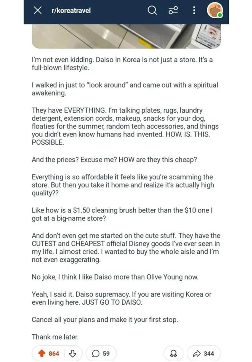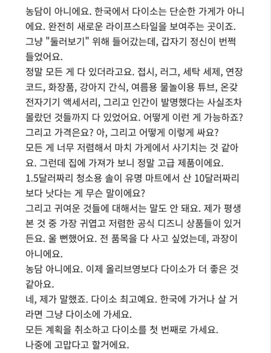 레딧에 올라온 다이소 미국인 후기 댓글 0 조회 568 2025-10-27 16:09 가자가자가자고 Lv.6 게시글 보기 총 게시글: 916개 총 댓글: 0개 걍 한번 들어가봤다가 정신이 번쩍 신세계 경험했다고 ㅋㅋ 가자가자가자고님의 다른 글 25.11.26 싱글벙글 좋소공장 특징 정리 25.11.26 타투를 한 경위를 설명하는 타투 25.11.26 "내년 설 전에 1인당 10만원씩 또?"…531억 뿌린다는곳 25.11.26 저가항공을 타지 말아야 하는 이유